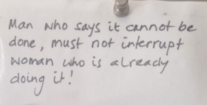 I grew up with this note on our fridge at home: ‘man who says it cannot be done, must not interrupt woman who is already doing it!’. That’s my Dad’s handwriting. He laminated that note. He put it on the fridge.